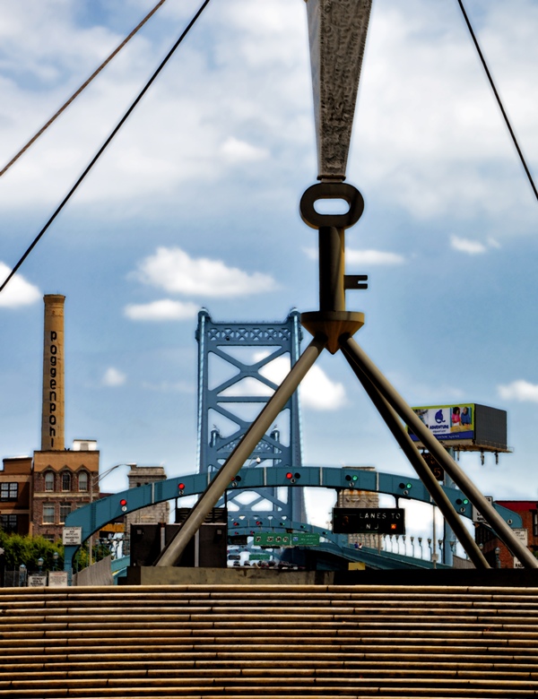 This steel sculpture by Isamu Noguchi marks the axis of Independence Mall and the Ben Franklin Bridge. Depicting a kite, bolt of lightning and a key, the massive piece is a tribute to Ben himself. I desperately wanted to stand beneath it and get a closer perspective, but my Mom said no. That’s right, I wasn’t allowed to cross the street today. Standing in Franklin Square Park, it is necessary to cross four lanes of splitting traffic on 6th Street to get to the base of the sculpture. And since my daughter was with us, I did not want to arm her with such ammunition as, “But you didn’t listen to your Mommy”. So, I stayed put in the park. Maybe next time…