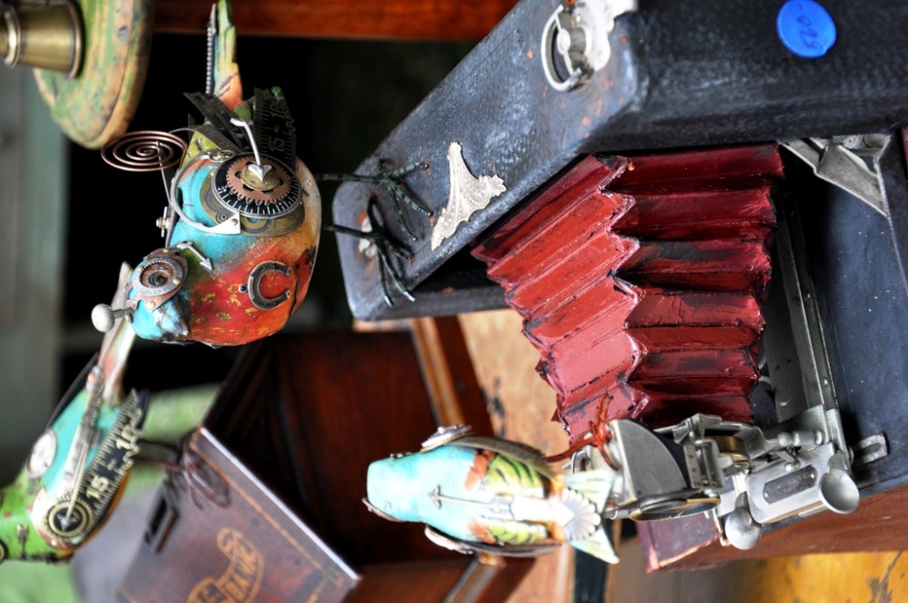 The work above, by Jim and Tori Mullan was my favorite of the day…intricate and fun pieces, table art and jewelry. I would love to add one of their creations to my collection and see this guy perched on my shelf everyday! I especially enjoyed their pieces that featured the bird sitting atop antique binoculars.