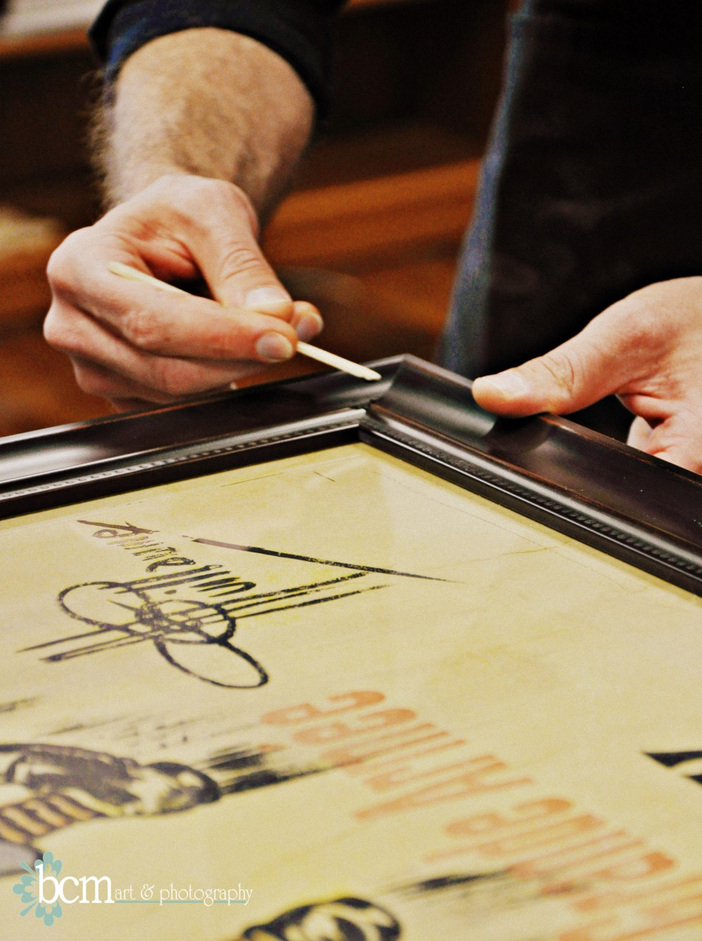 The second painting that came through the door was done by Adam Vinson. Trust me, click on the link to see some of Adam’s work. Today, Adam was also working on the custom frames for the vintage posters along with the shop owner, Jeramie. I had the pleasure of documenting their work. You can check out all of the shop info here.